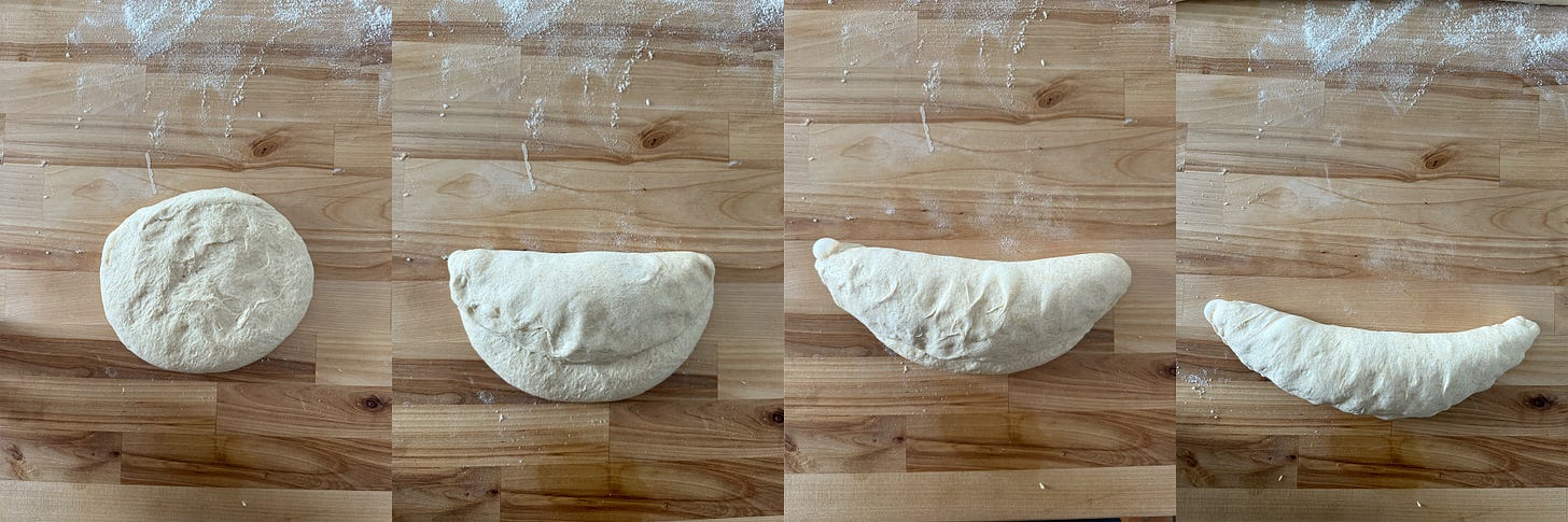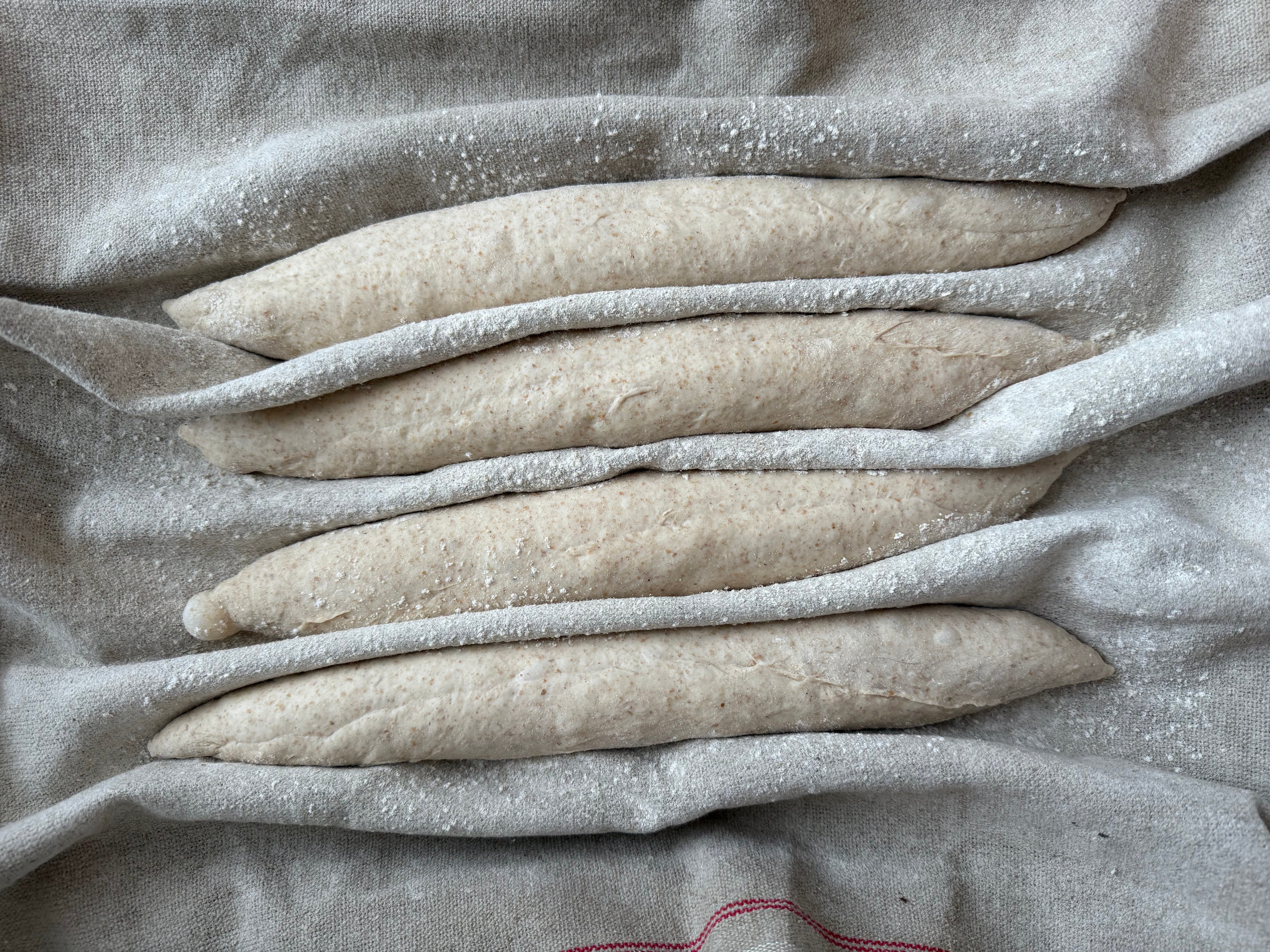 I flour my couche or towels and set them near my workstation on a cutting board or sheet tray. I shape my breads using the notes in number 9, above - a little flour up top, swipe a round through it, fold the top edge down 2/3, fold the newest top edge down just over that, then fold the new newest top edge down and seal along the bottom. It should look like a smile. Swipe through a bit of flour again and roll steadily out towards the ends, focusing on a nice taper and then coming back to the middle to roll out some more and lengthen. This will take some practice - go ahead and watch some videos (I’ll add one to this post soon) but really you just need to do it over and over again. Nestle them side by side in your couche or floured towels. You can cover them with another towel or an inverted sheet tray.