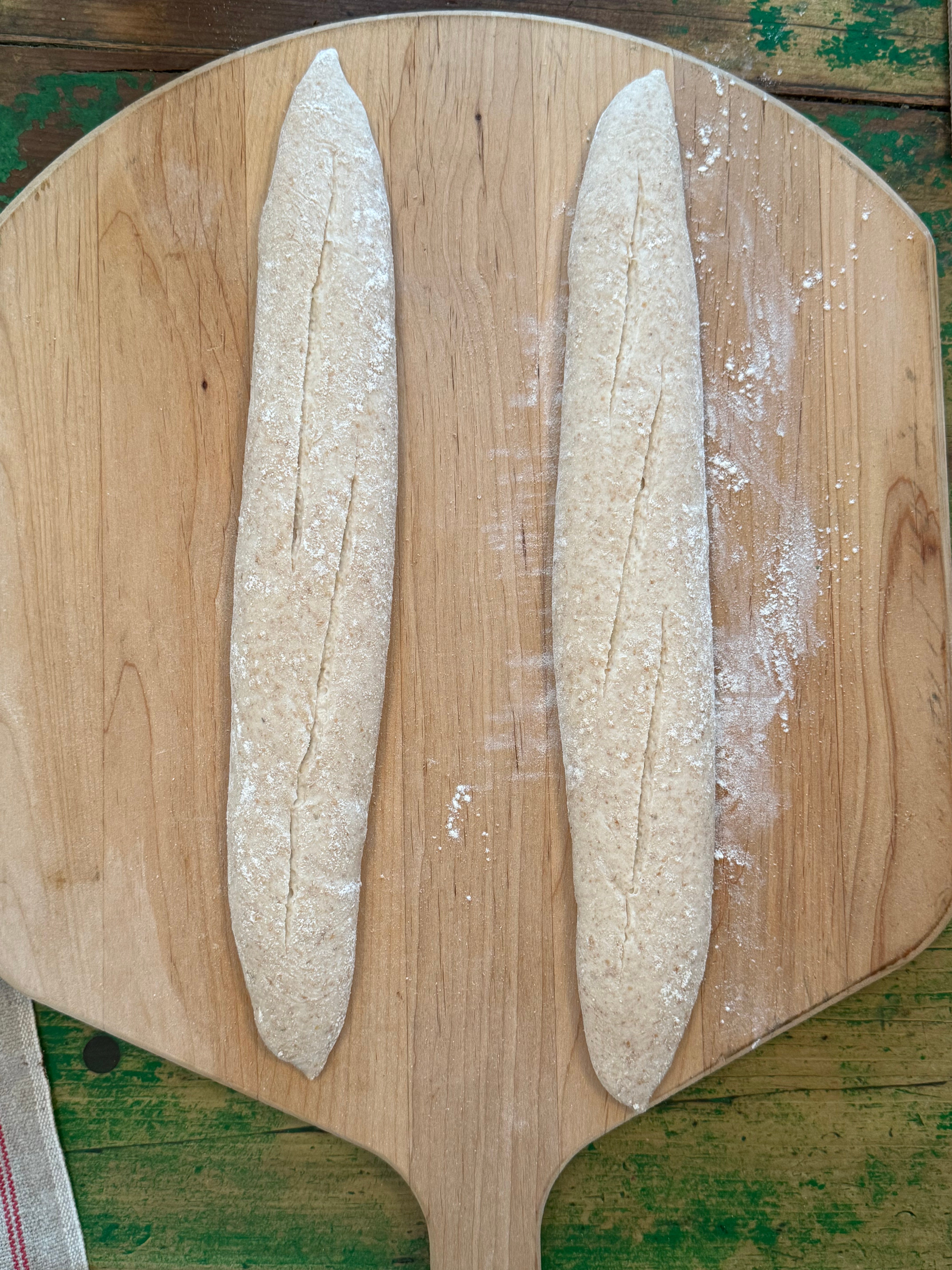 While I’ve almost entirely stopped scoring many of my other loaves, I find a score on a baguette makes a big difference in how it expands during baking, affecting the texture and rise of the whole loaf. I use fresh or pretty new blades to score. Replacements are cheap and you can buy them in bulk. I like one long line down the middle or side best but obviously a classic baguette score is a satisfying thing, and you can try whatever you want. I wouldn’t stress about it - if you do want to go the traditional route, keep in mind that the scores - 2 or 3 or 4 of them on a home-sized loaf - should be not quite straight, angling just slightly from one side of the loaf to the other, and should overlap by about 1/4 of their length, comme ça:
