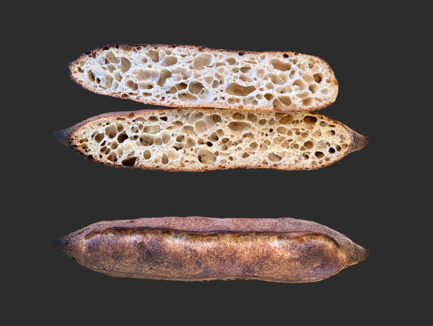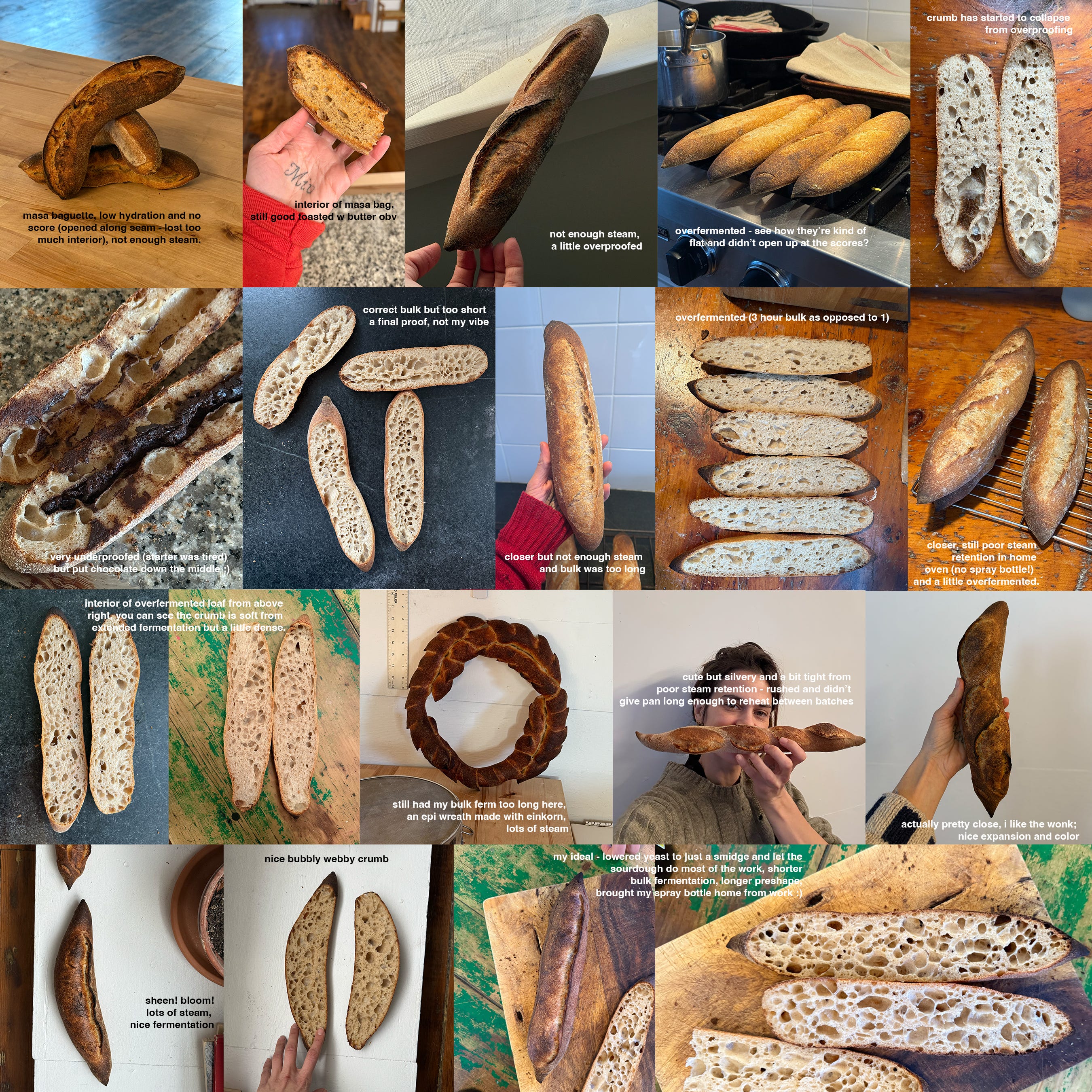 I’m juicing it up for you but that was the gist. But in order to break baguettes down I first had to make perfect ones in my kitchen. I don’t work in a professional setting anymore, I test all my recipes from my studio and home kitchen so that they accurately reflect the experience of the home baker (I last made baguettes regularly for a couple years in a bakery in Austin, TX in the early 2010s). As I embarked on this journey without the niceties of a walk-in fridge and steam-injected oven, I faced many an annoying challenge, worked through iteration after iteration of formula and process, took pages of notes, made many croutons, got some steam burns, all to realize that upon reaching a technical apogee - which, I must say, I feel I have - not only do I not want to forsake the perfect baguette, but I actually want to eat them all the time, more than I want to eat many other breads, and I find the qualities that traditionally define them - the ratio of crust to crumb, a thin crisp shell around a cobwebby but still spongey interior, even their demonic baton-like form - lovable and worth saving.